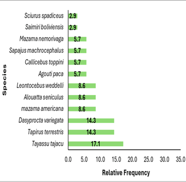 To determine the abundance of large and medium-sized mammals in the evaluation area, the relative frequency index was found only from the records in linear transects. In figure two, the 12 species that were recorded in the linear transects are presented, the most frequent being the Tayassu tajacu with 17.1, followed by Tapirus terrestris and Dasyprocta variegata, both with 14.3, and the third most frequent was the Mazama americana, Alouatta seniculus, and Leontocebus weddelli all with 8.6, these species were mostly recorded using footprints.