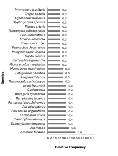 To determine the abundance of the species in the evaluation areas, the relative frequency index was found; The effort being the 15 Mackinos Lists (LM) made during the evaluation, where zero (0) is equal to no records in the LMs and 1 is equal to those that were recorded in all the LMs. The figure shows the 30 species that obtained the highest relative frequency index, with Amazona farinosa being the most frequent with 0.6, followed by Ara macao with 0.5 and Sciaphylax hemimelaena along with 9 other species being the third most abundant.