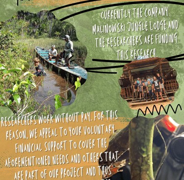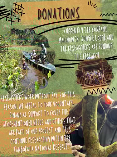 Currently the Malinowski Jungle Lodge enterprise and the researchers are financing this research. However, in our Research Area there are several work teams missing and the Researchers work without a salary. For this reason, we appeal to your voluntary financial support to cover the aforementioned needs and others that are part of our project and thus continue researching within the Tambopata National Reserve.